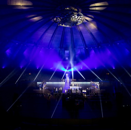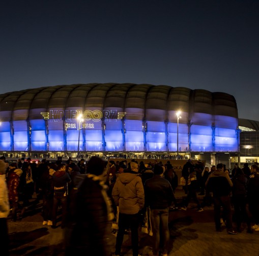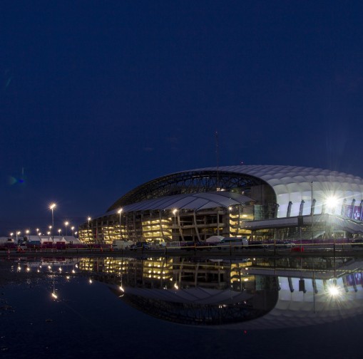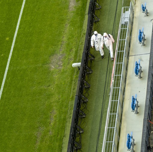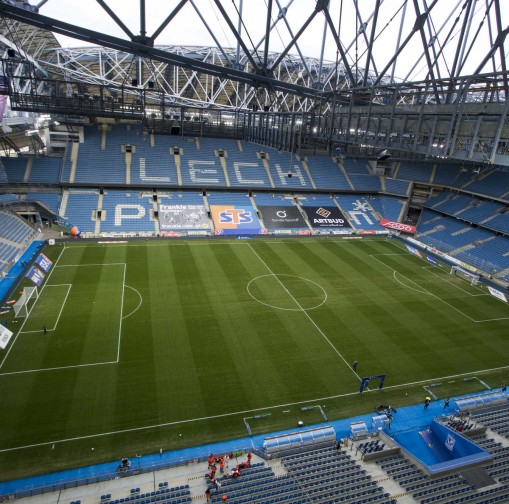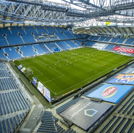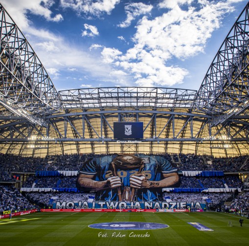 Mecz piłkarskiej ekstraklasy Lech Poznań - Legia Warszawa fotografowany z dachu stadionu