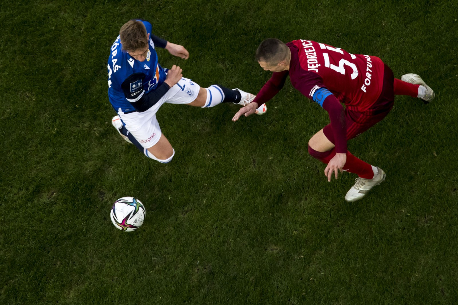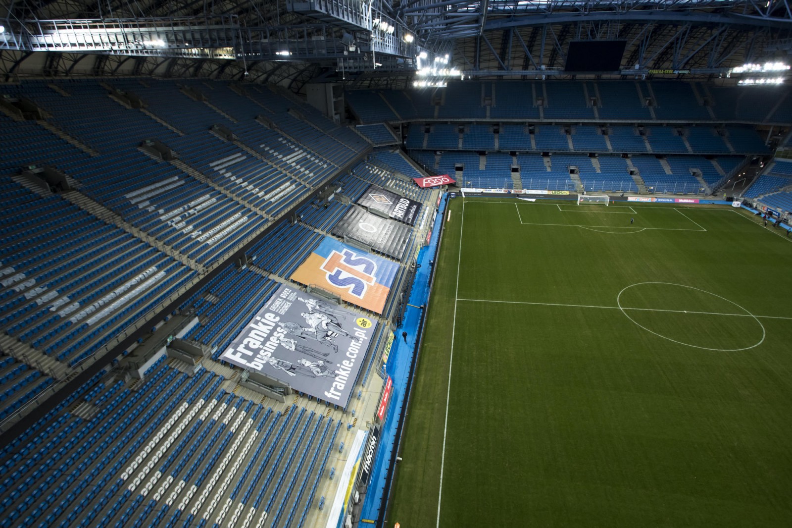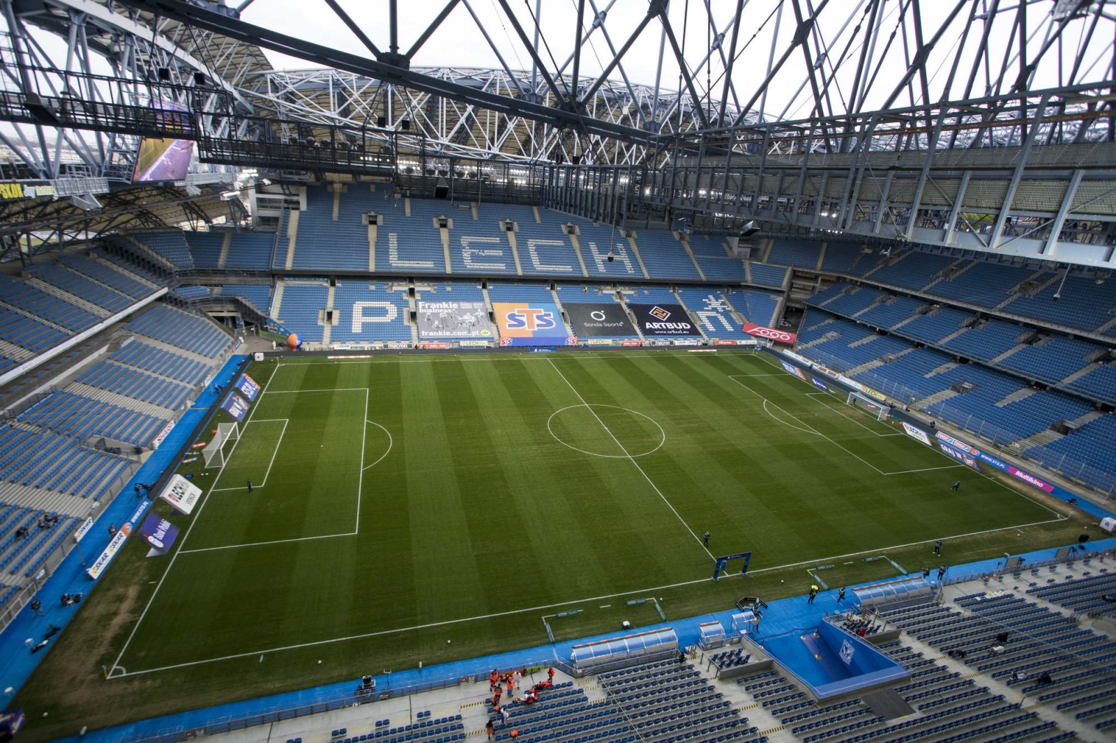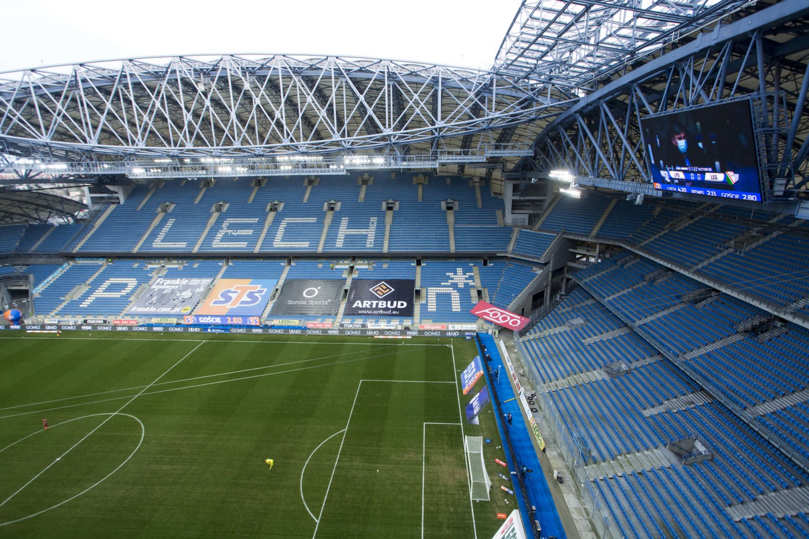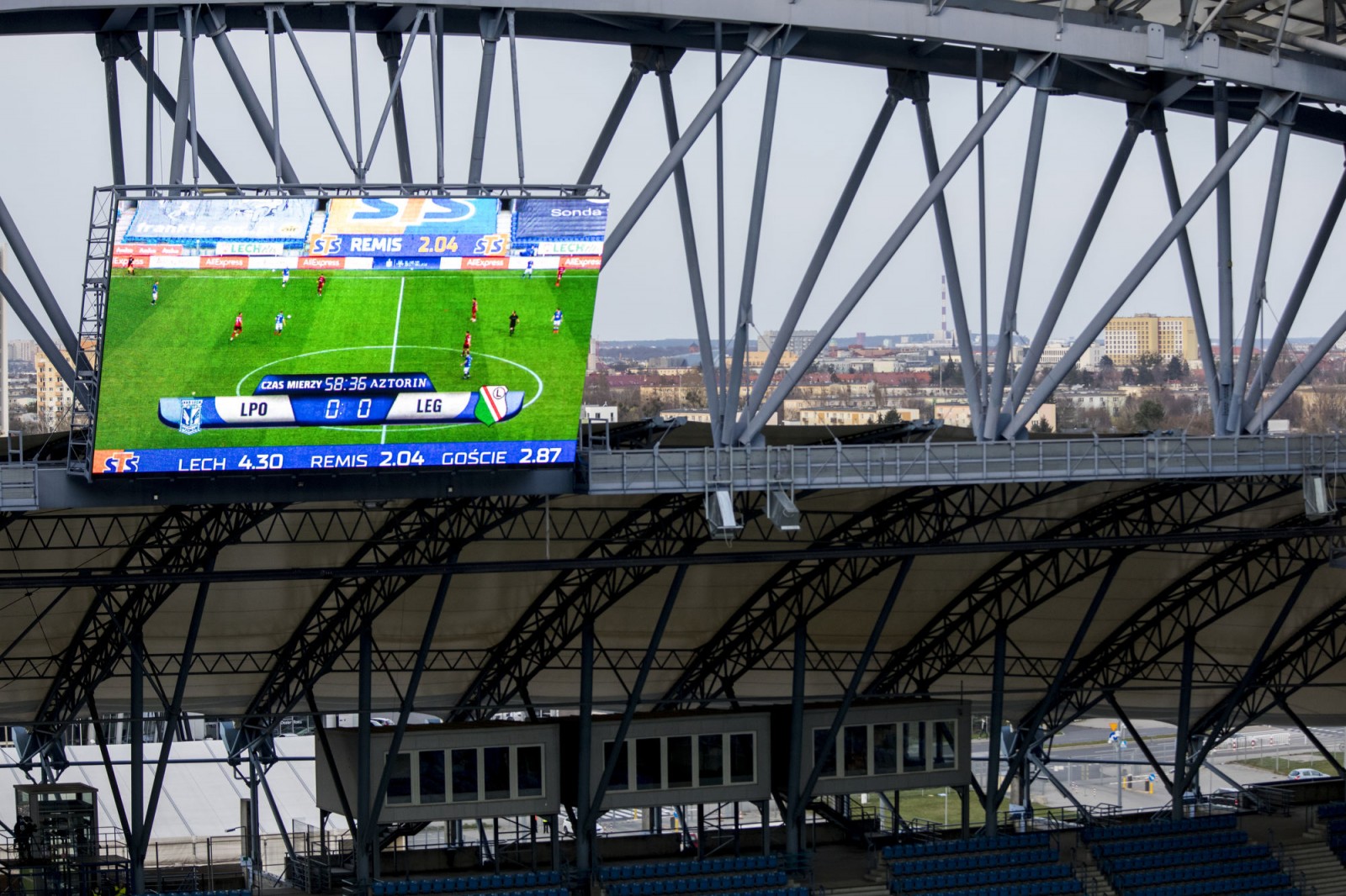 Mecz piłkarskiej ekstraklasy Lech Poznań - Legia Warszawa fotografowany z dachu stadionu