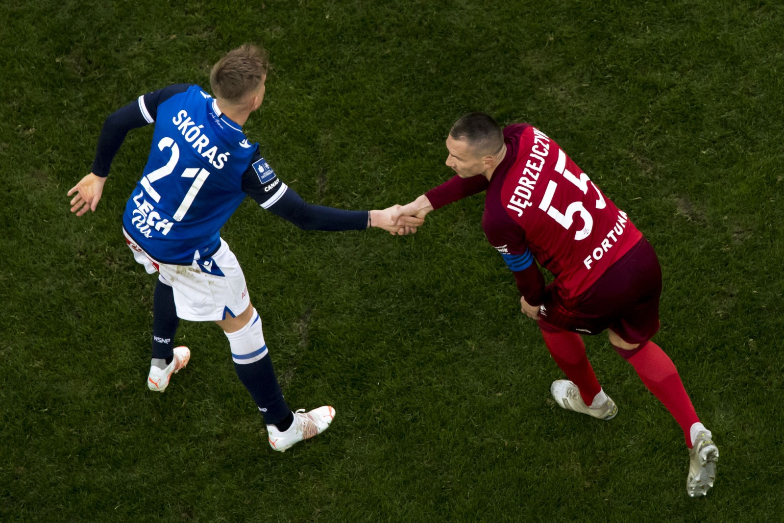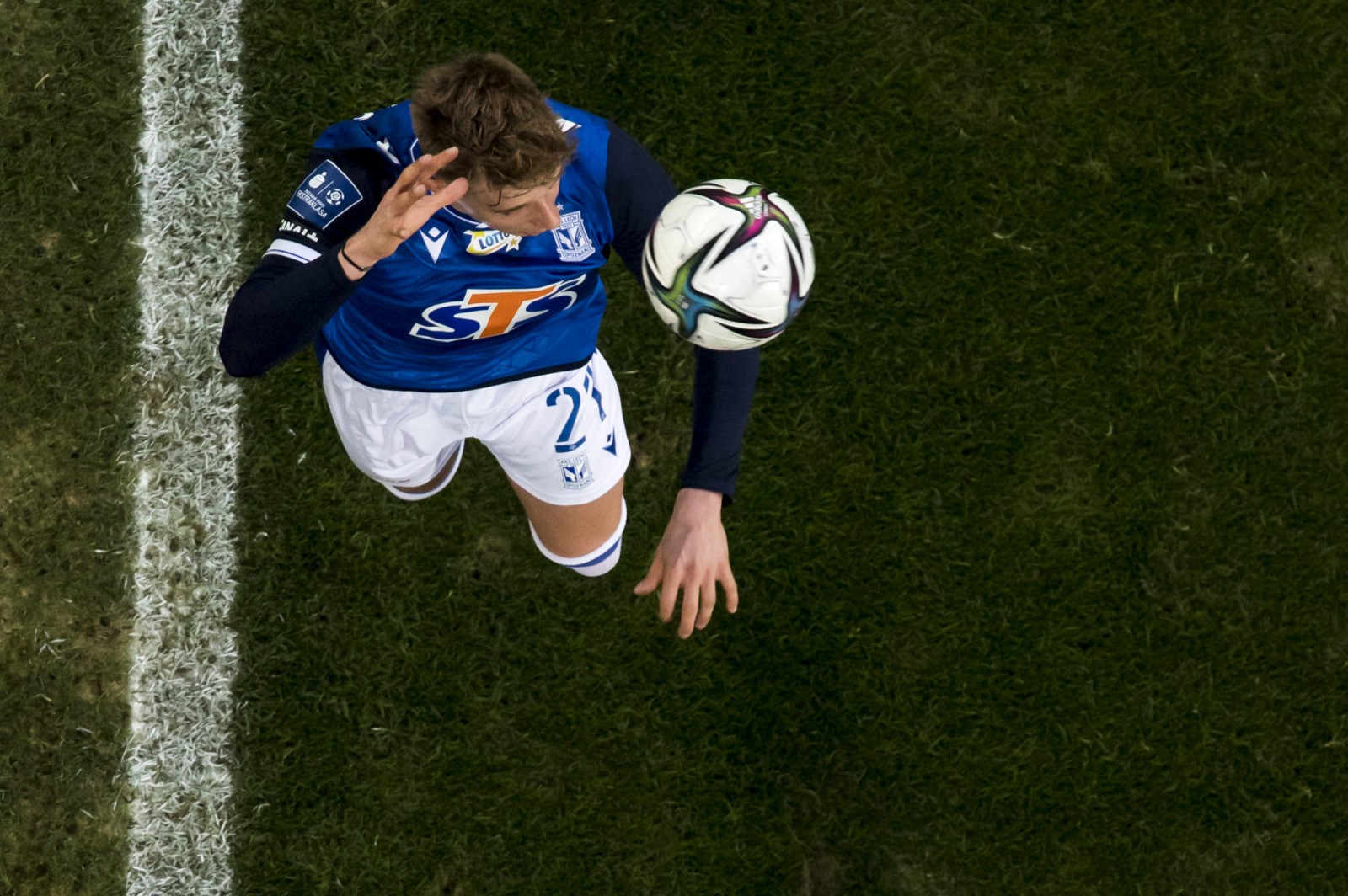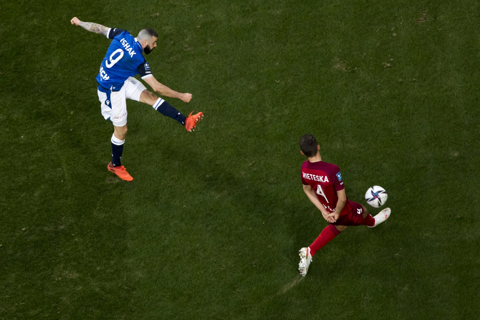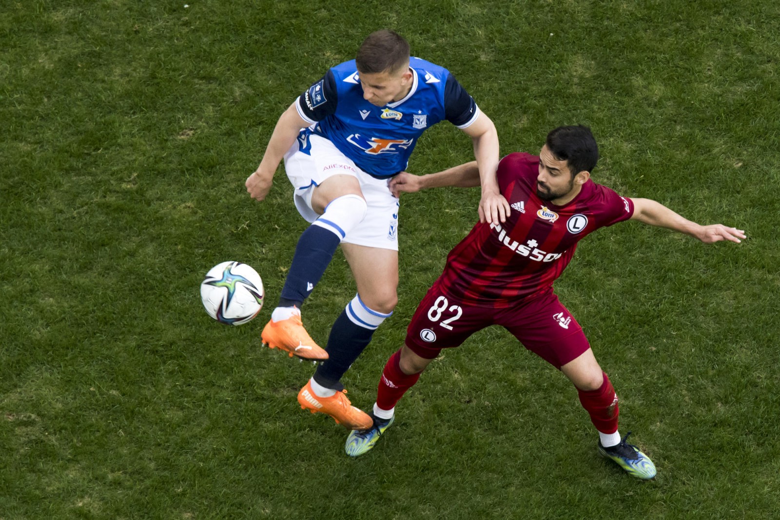 Mecz piłkarskiej ekstraklasy Lech Poznań - Legia Warszawa fotografowany z dachu stadionu