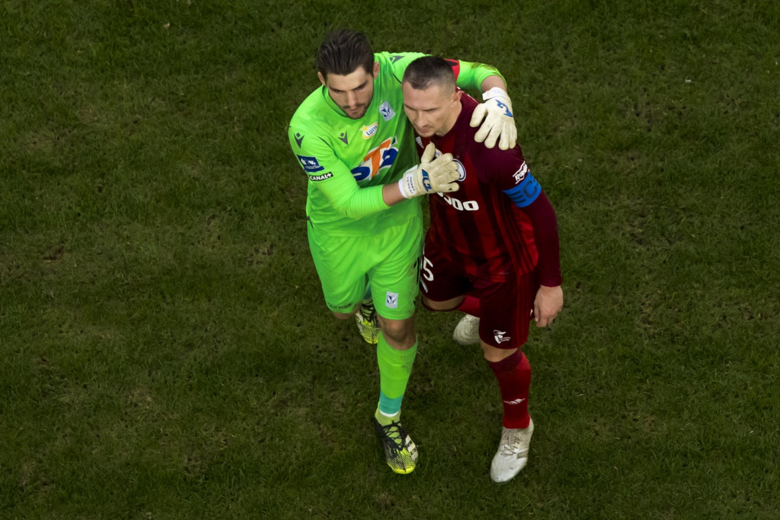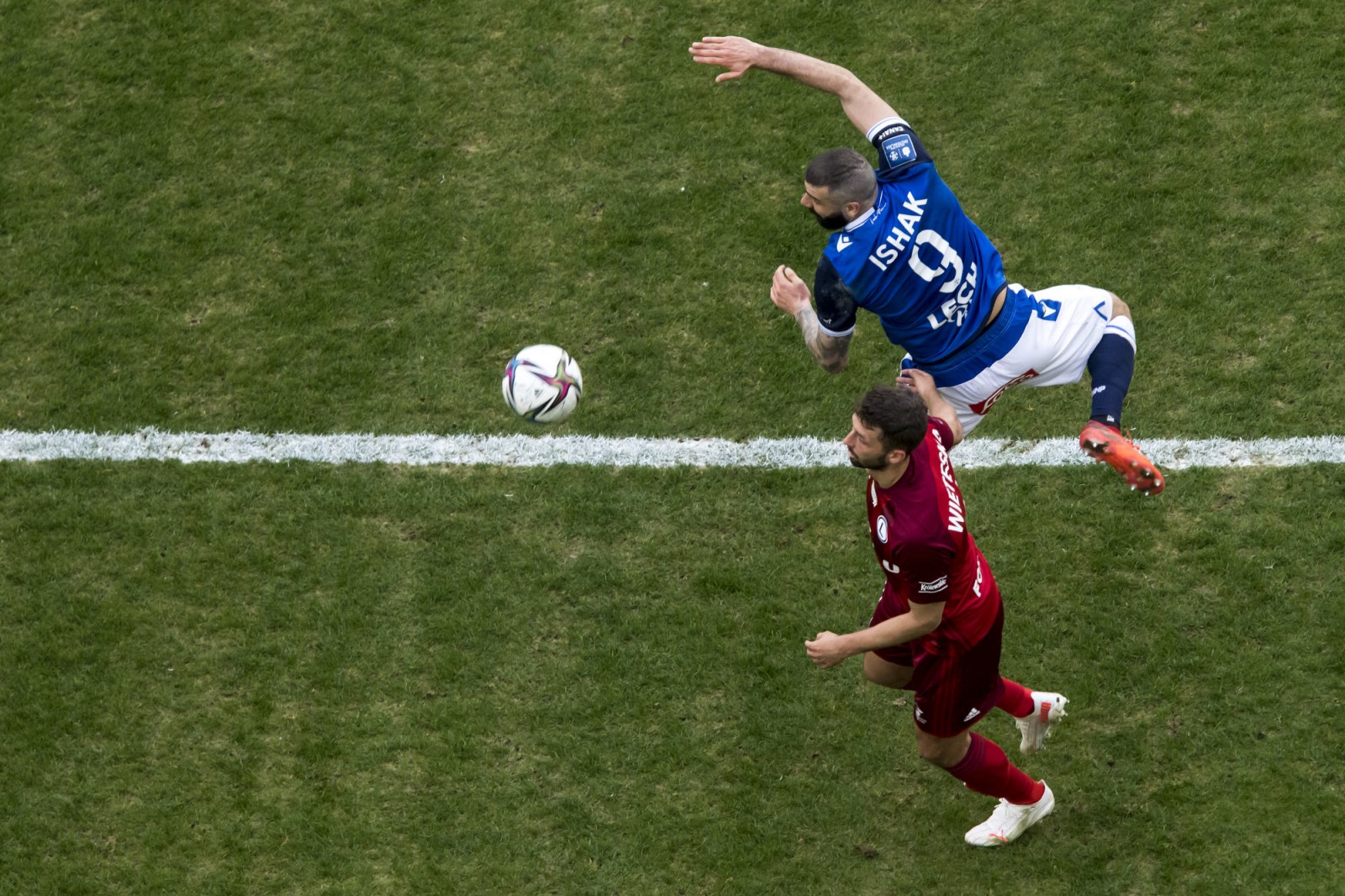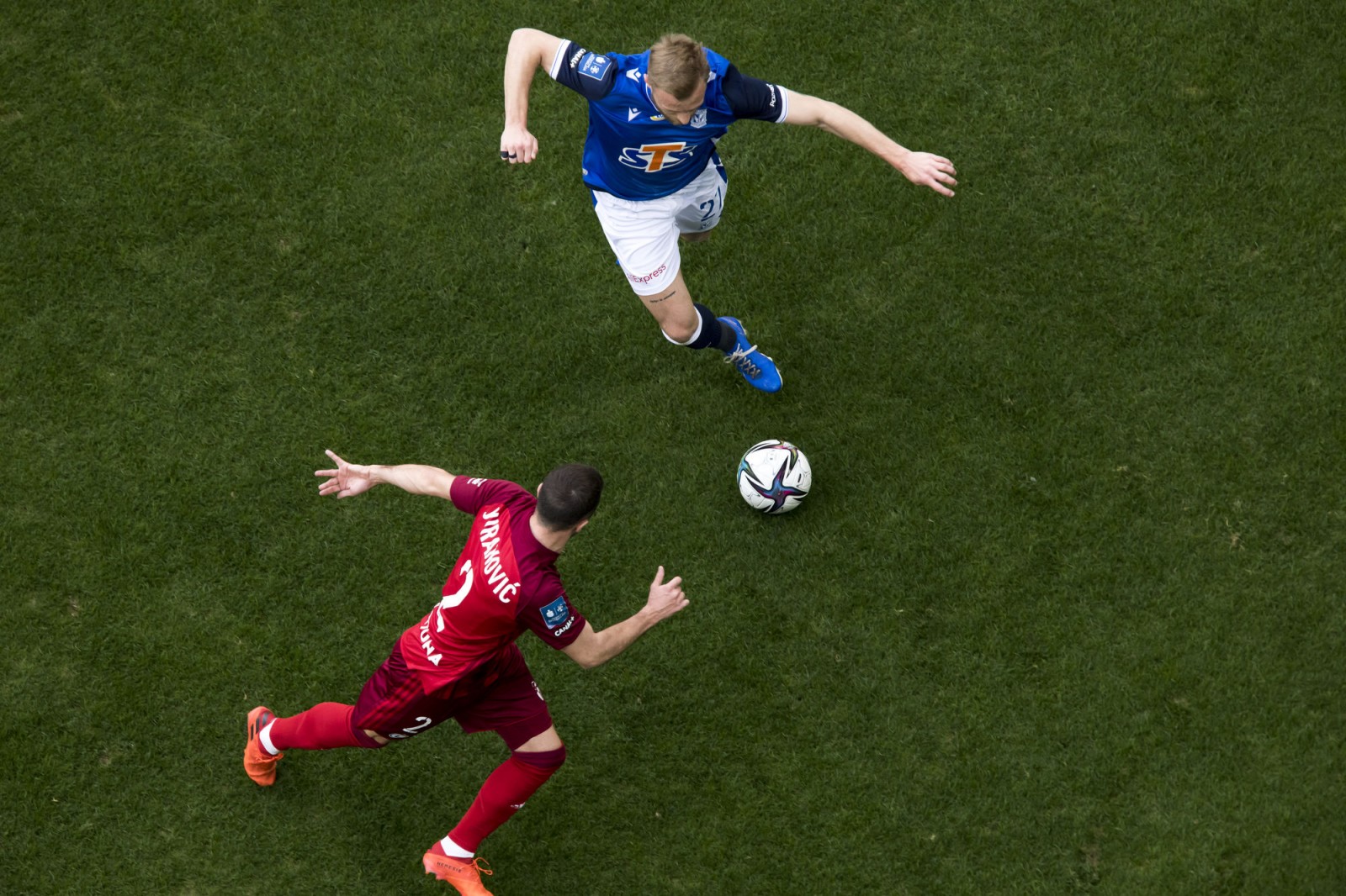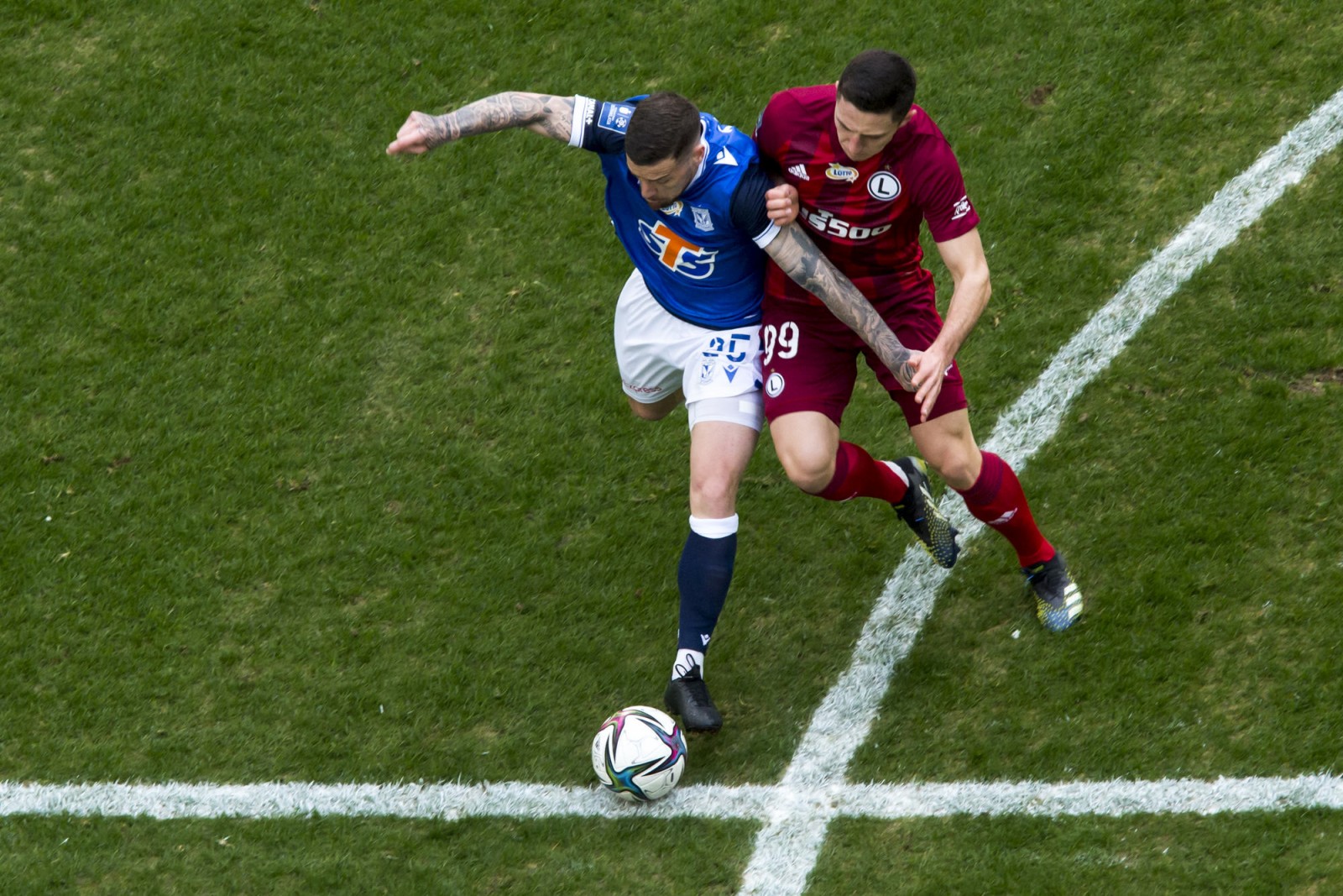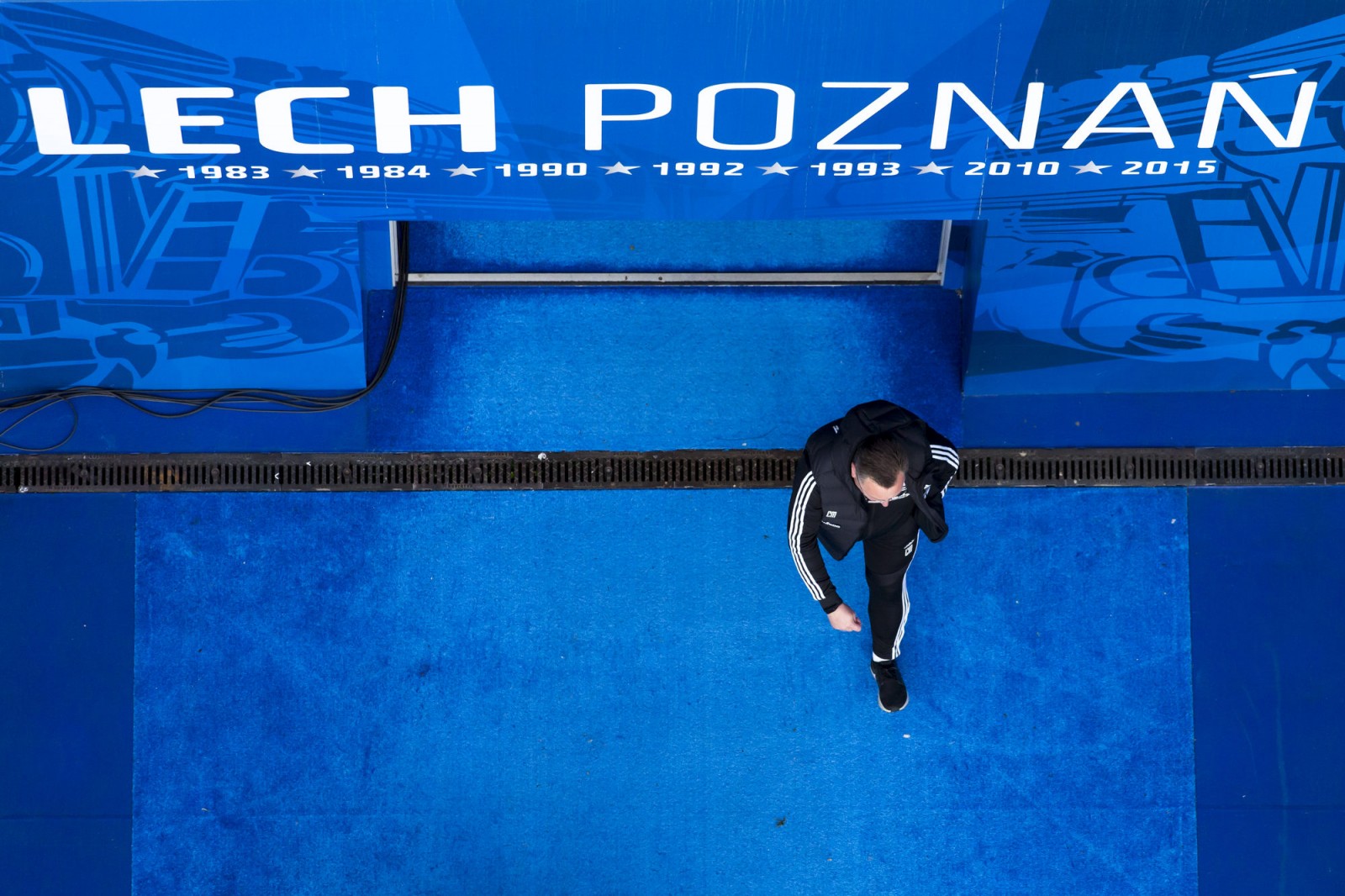 Mecz piłkarskiej ekstraklasy Lech Poznań - Legia Warszawa fotografowany z dachu stadionu