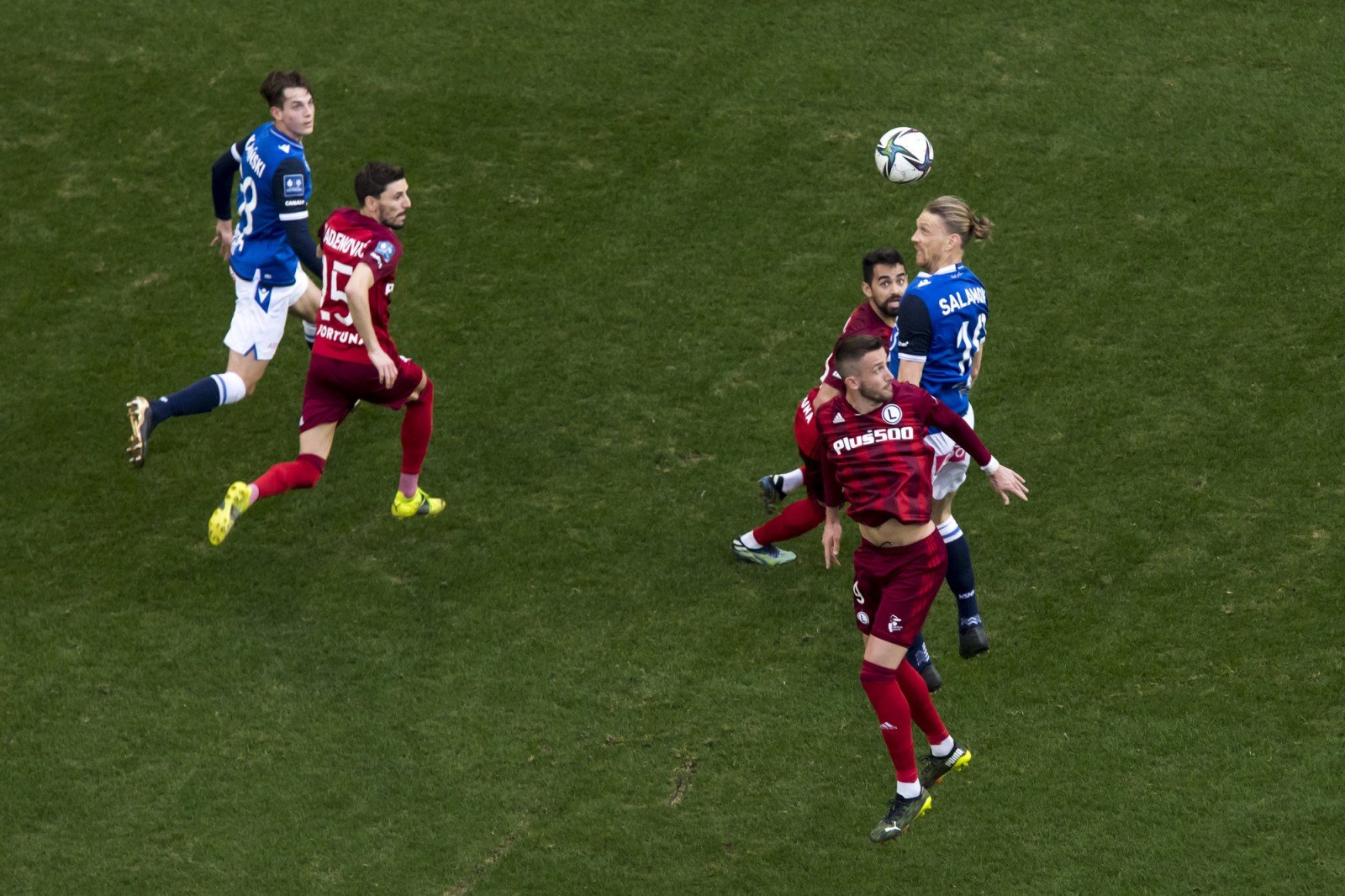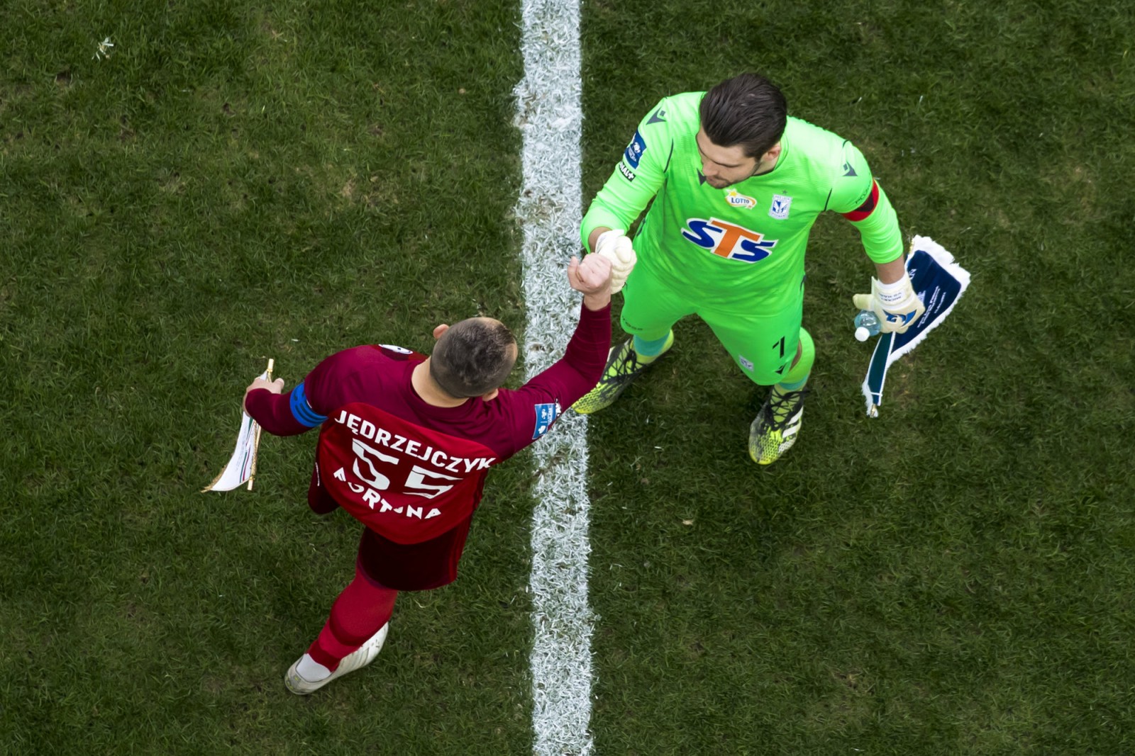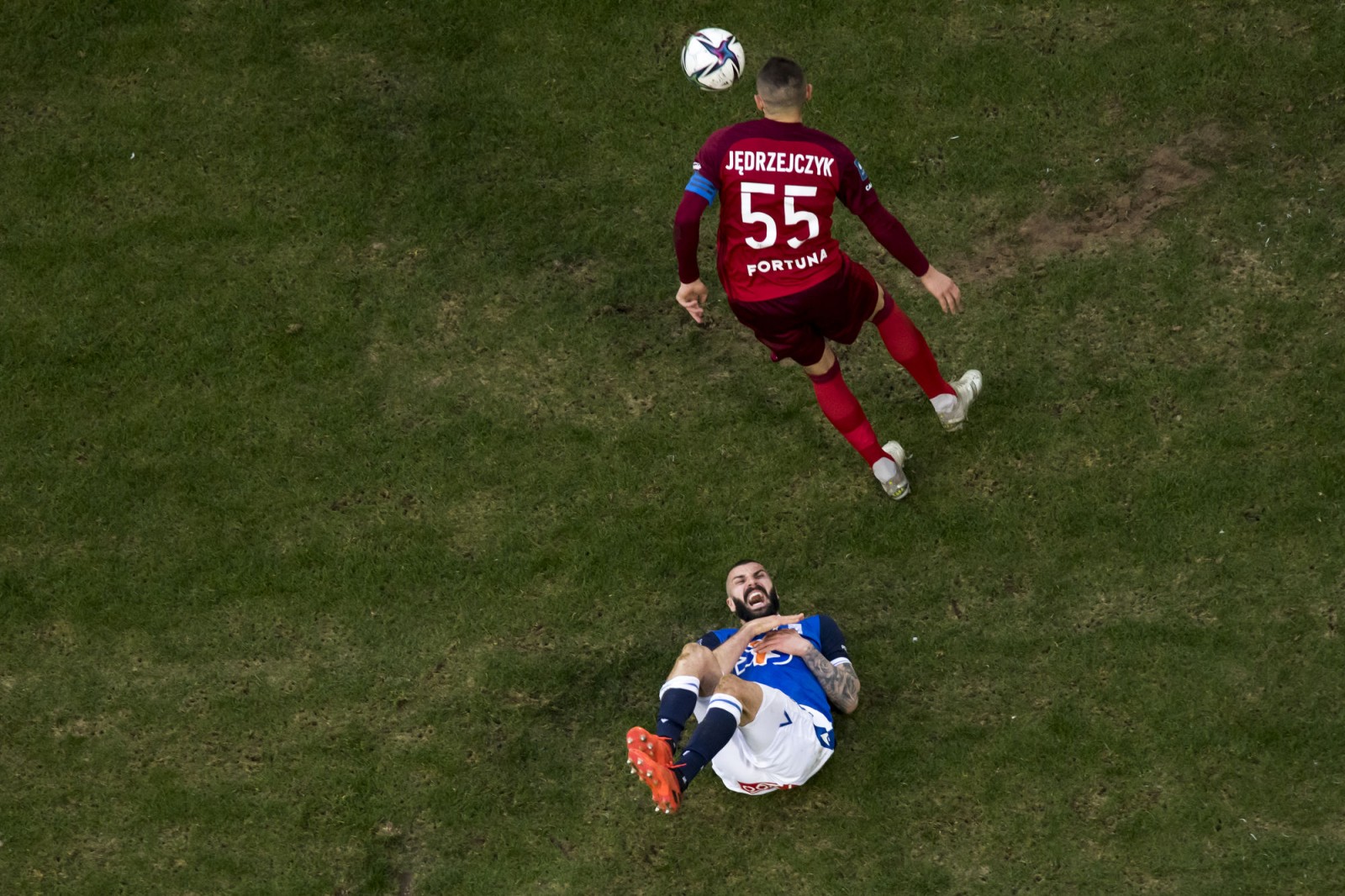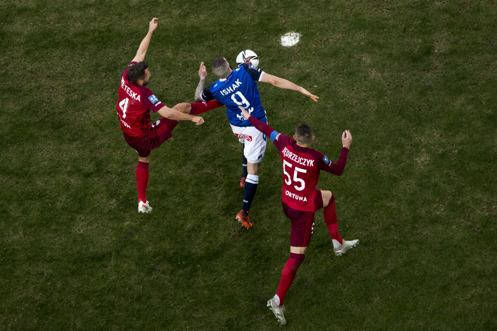 Mecz piłkarskiej ekstraklasy Lech Poznań - Legia Warszawa fotografowany z dachu stadionu