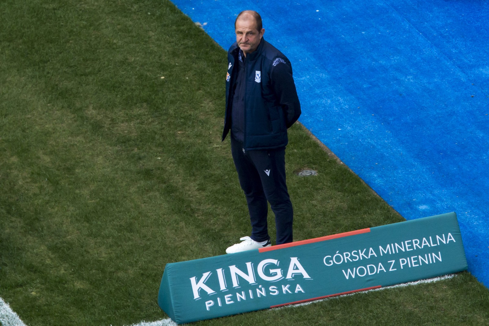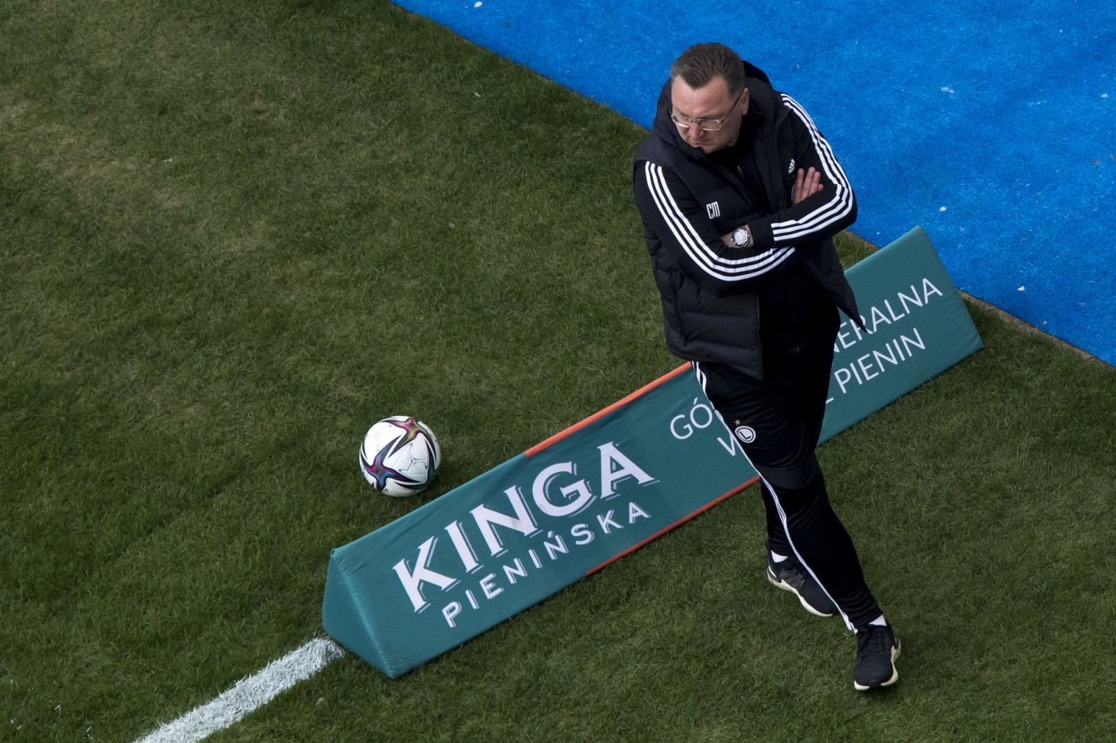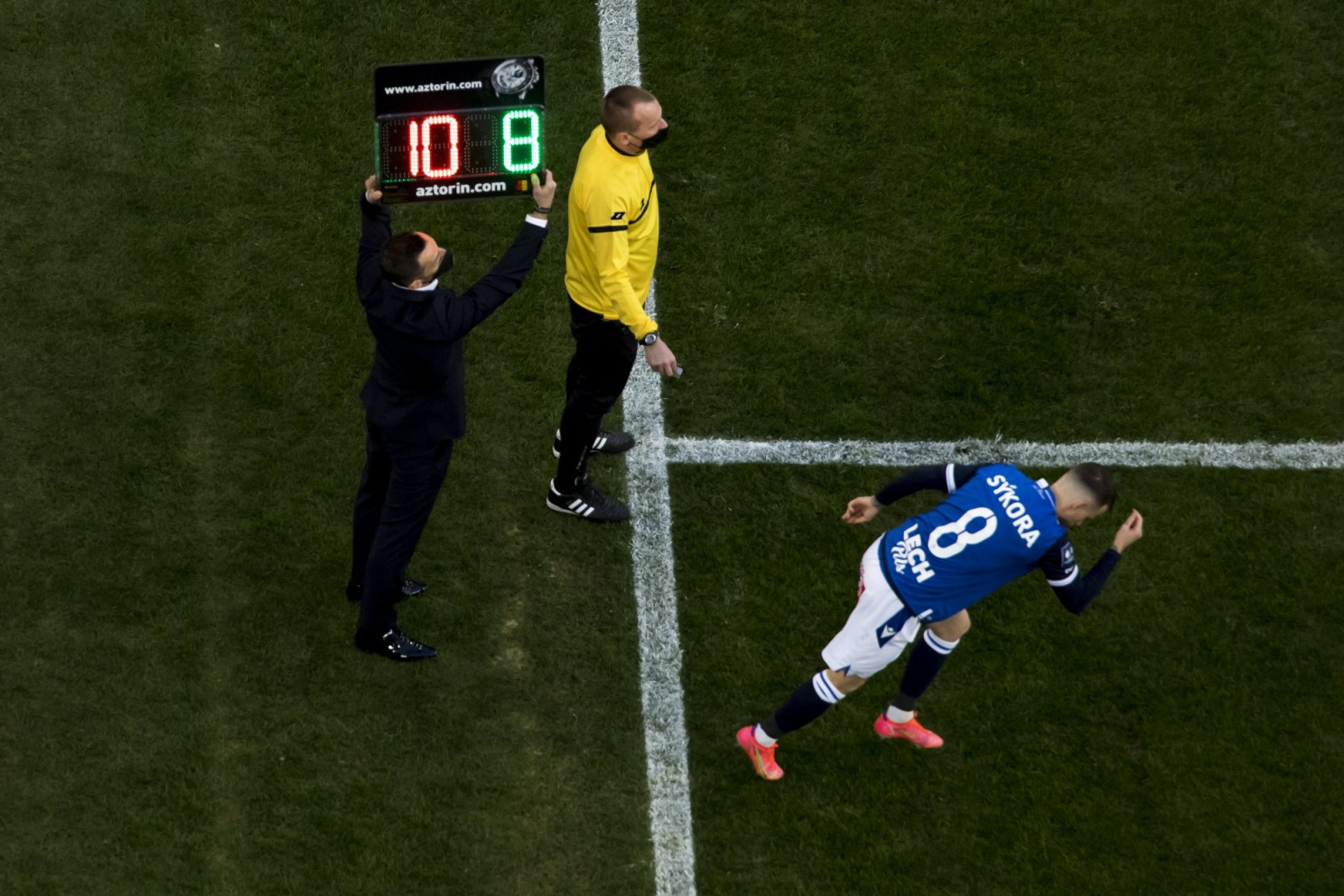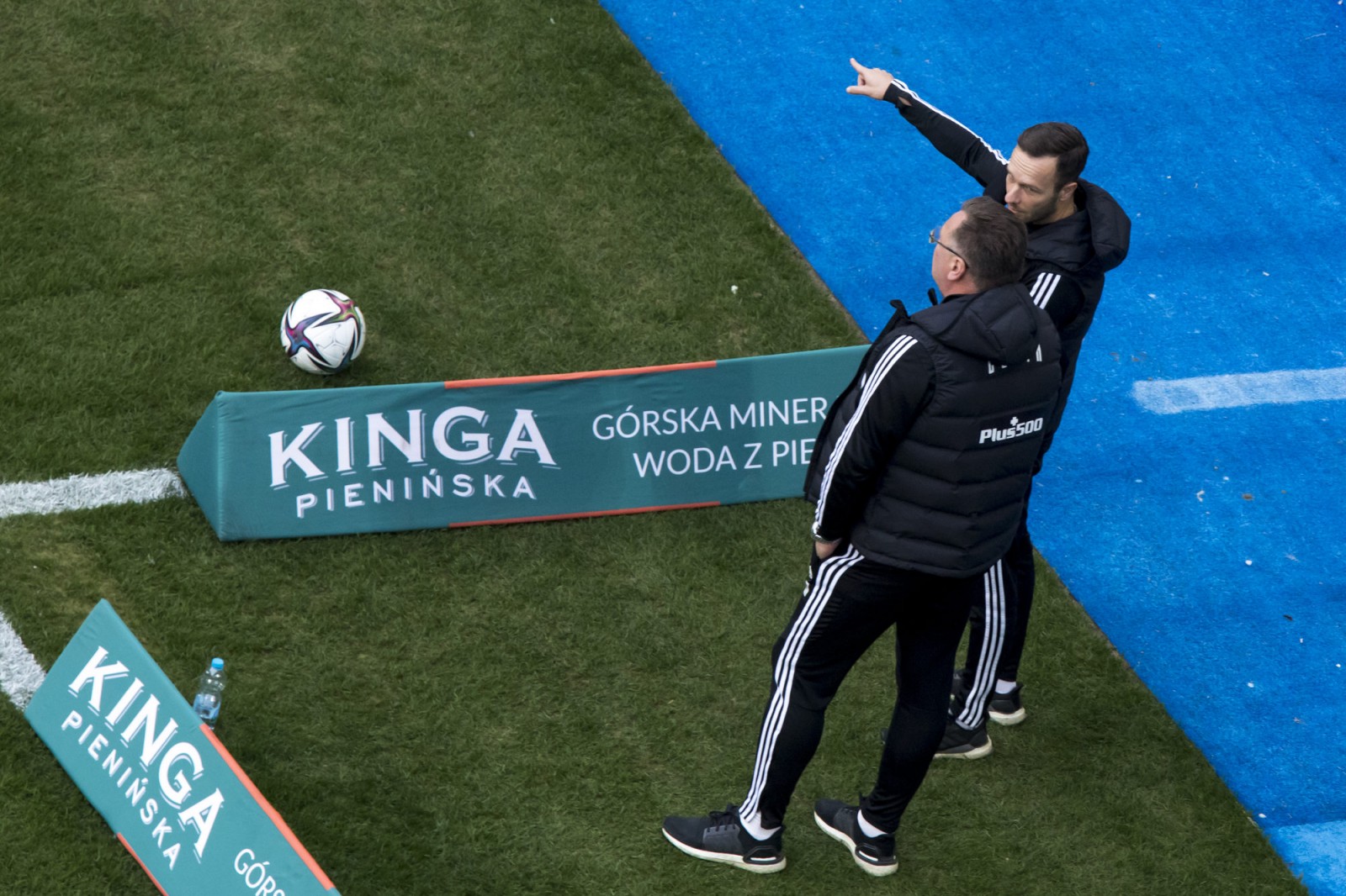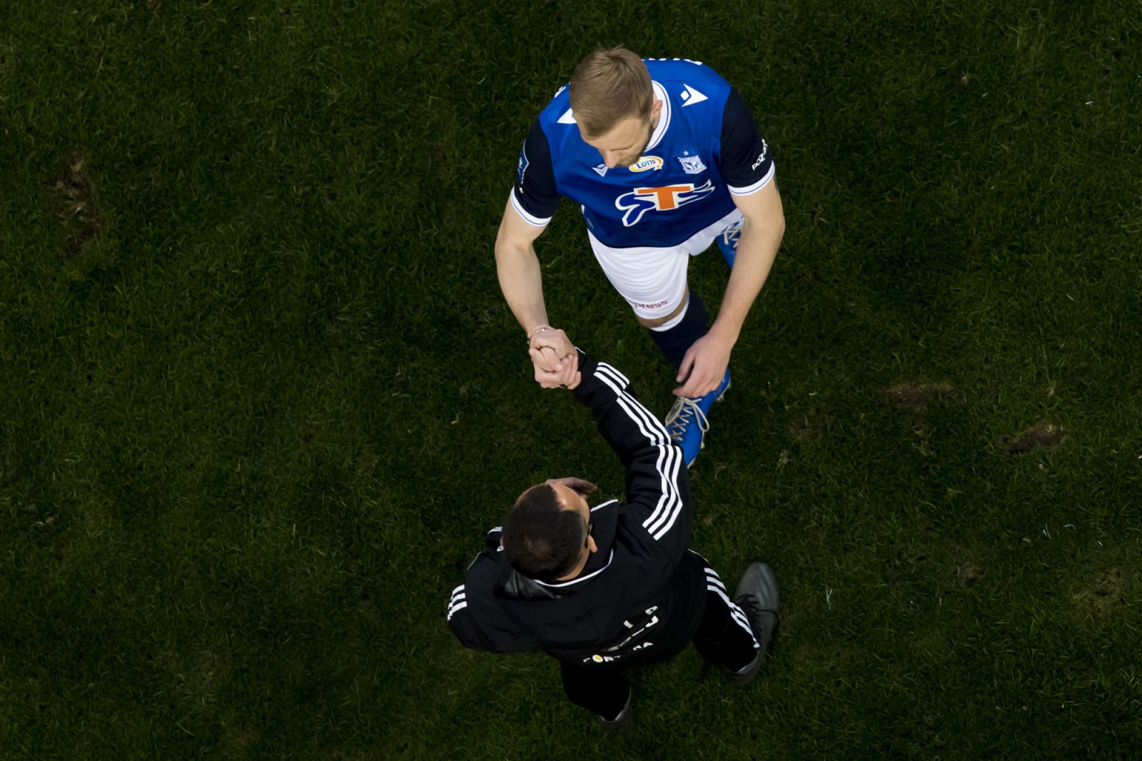 Mecz piłkarskiej ekstraklasy Lech Poznań - Legia Warszawa fotografowany z dachu stadionu