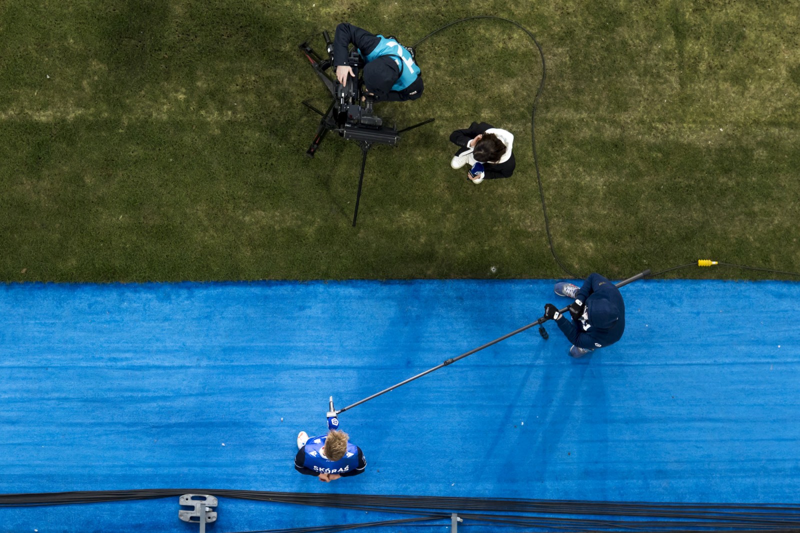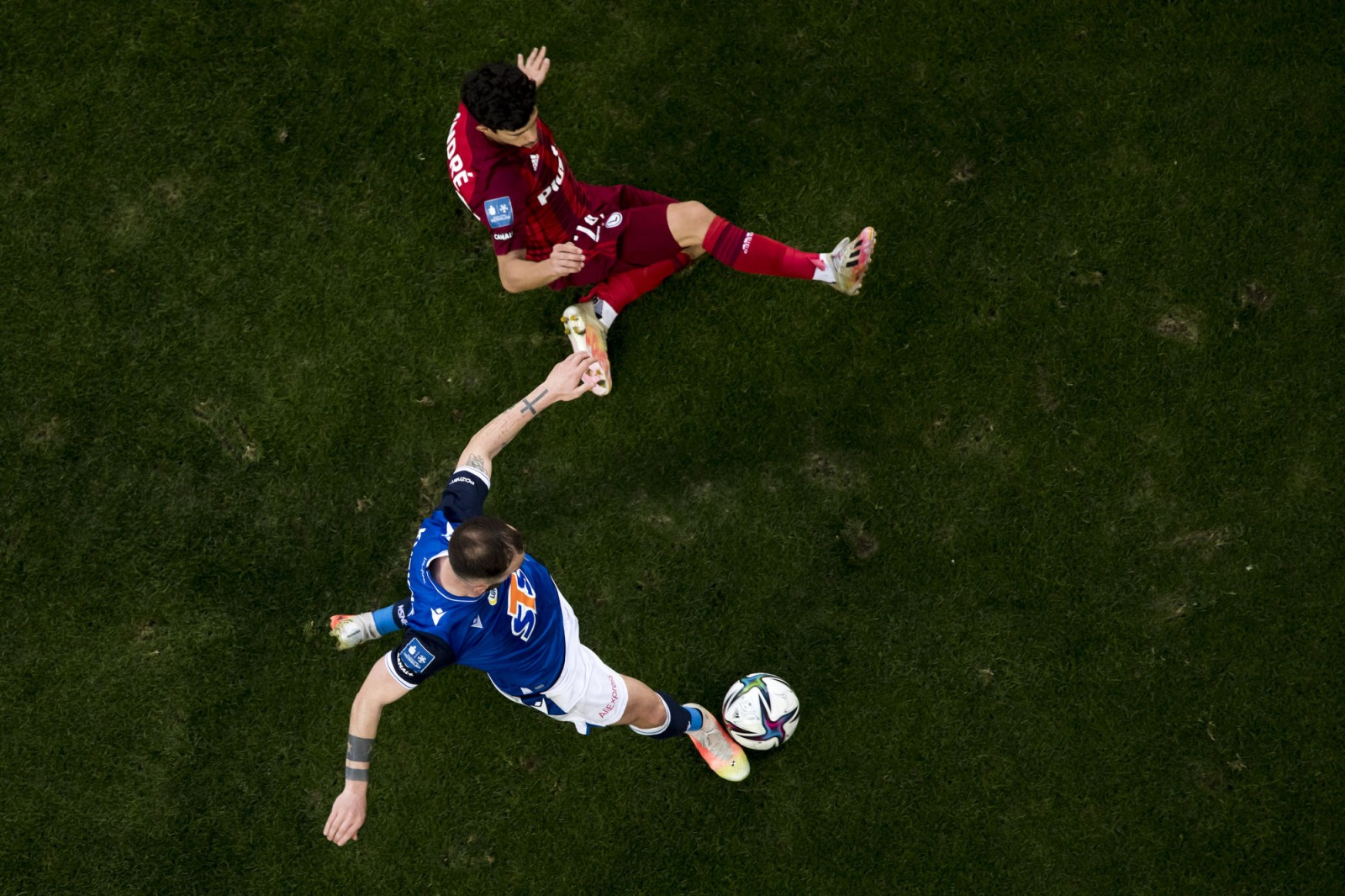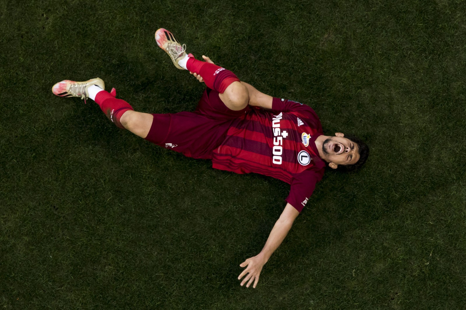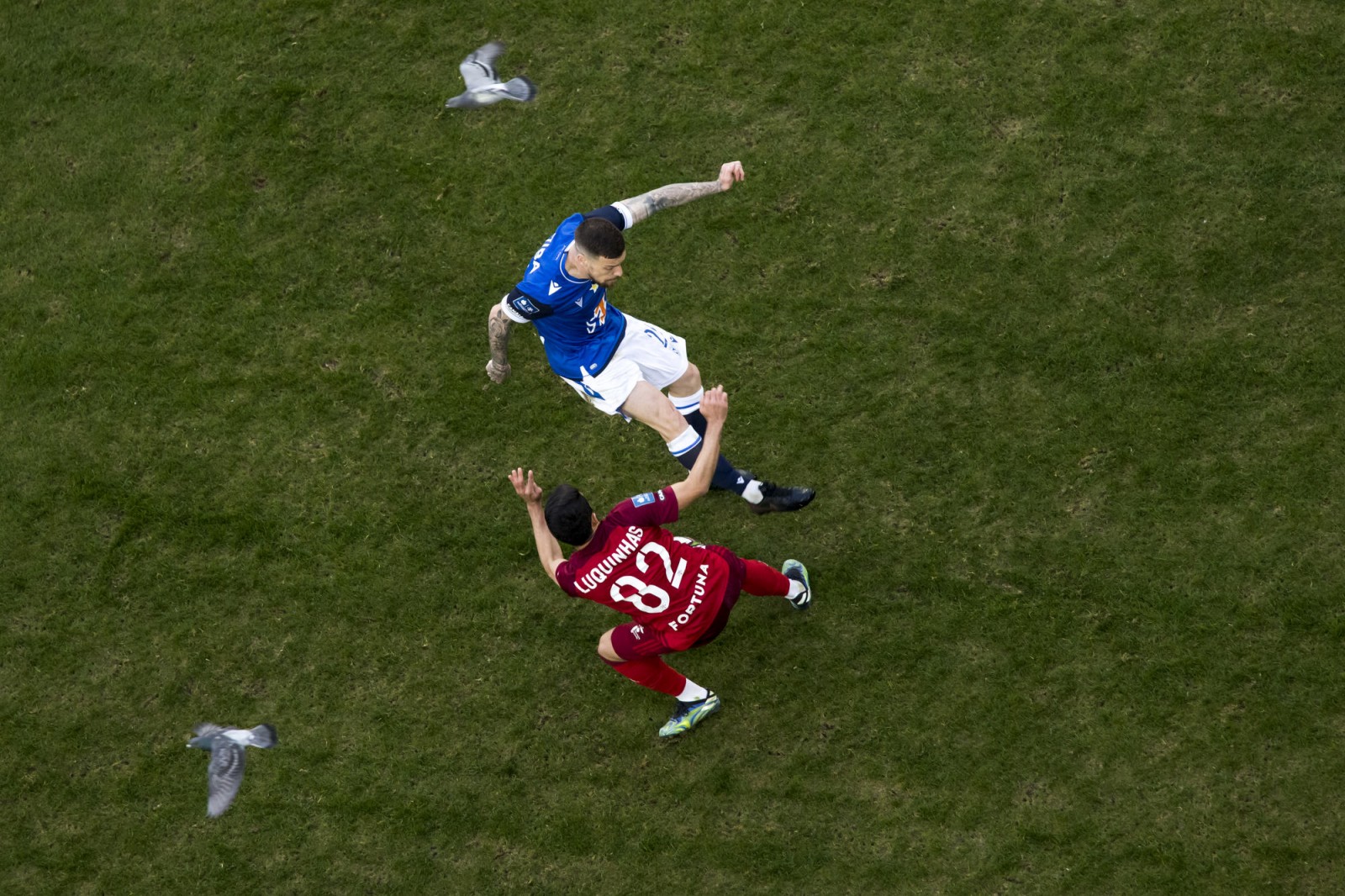 Mecz piłkarskiej ekstraklasy Lech Poznań - Legia Warszawa fotografowany z dachu stadionu